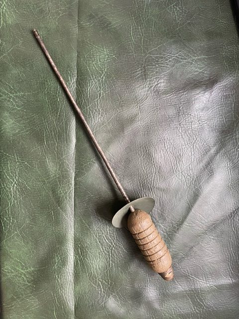 with a brass fuse mounted to the tip and a long steel tail.